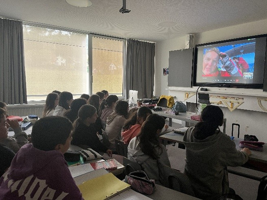 Tout au long de notre périple nous avons été en contact avec la classe 10VP1 de l'EPS de Cugy. Nous avons même eu une discussion avec eux via Teams lorsque nous longions les côtes sardes. C’était un plaisir de les savoir à nos côtés et quelle émotion de voir notre photo en grand sur le mur de leur classe